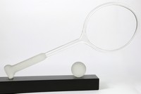 49 - HANS GODO FRABEL STUDIO GLASS TENNIS RACKET & BALL Hans Godo for Frebel Studios art glass tennis racket and ball. Base of racket holds raised FS and is dated 1987. Racket measures 18 1/4" length and ball 2" diameter.