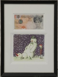 4 - 2pc BANKSY 'DI-FACED TENNER' & 'RUDE SNOWMAN' Two Banksy offset lithographs including 'Di-faced Tenner' on paper depicting princess Diana and 'Rude Snowman' Christmas card from 'Santa's Ghetto' pop-up in London. Card holds stamp to verso. Both items are framed together with glass on both sides. Tenner measures 5 1/4" x 3 3/4" viewable. Postcard measures 6 1/8" x 5 1/4" viewable. Frame measures 14" x 10 1/4".