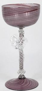 50 - WINGED SEA SERPENT SWIRLED ART GLASS GOBLET Art glass goblet with purple swirl decoration and winged sea serpent handle. Signed to base and dated 1993. Measures 8 7/8" height.