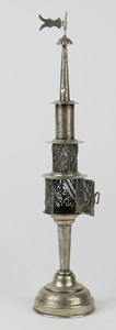 6 - ANTIQUE GERMAN SILVER SPICE TOWER 19th Century German silver Judaica spice box in the form of a tower having exceptional filigree work. Marked to edge of base. Measures 11 1/4" height.