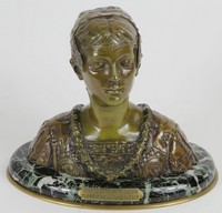 7 - ROLAND GRANGE-COLOMBO 'GRAND DAME' BRONZE BUST Roland Grange-Colombo (Italian, 19th century) bronze sculpture. Titled 'Grande Dame Patricinenne Florentine au Xvieme Siecle' to plaque. Signed to her left shoulder. Holds Paris foundry mark to verso. Measures 9 1/2" overall width. Measures 6 3/4" height + 1" marble base.