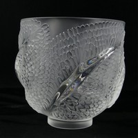 7 - LALIQUE CRYSTAL MARTINETS VASE Lalique frosted crystal Martinets vase decorated with swallows. Signed to underside. Measures 9 1/2" height.