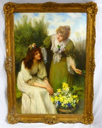11 - WILLIAM OLIVER 'CONFIDENCES' OIL PAINTING / CANVAS William Oliver (French/British. 1823-1901) oil painting on canvas depicting two women with a basket of flowers. Titled 'Confidences'. Signed lower left. Measures 40 3/4" x 28" + 4" frame. Provenance: Purchased at Sotheby's New York in 1997. Holds labels to verso.