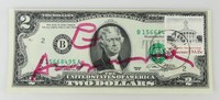 14 - ANDY WARHOL $2 FIRST DAY COVER OCTOBER 29, 1979 Two Dollar Bill stamped as First Day Cover, post marked October 29, 1979. Signed Andy Warhol with soup can in red marker to front. Signed in black marker and stamped to verso. Measures 6 1/8" x 2 5/16".