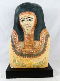 15 - EGYPTIAN CARTONNAGE SARCOPHAGUS MUMMY MASK Egyptian Cartonnage Sarcophagus Mummy Mask elaborately painted. Measures 16" width x 25 1/2" height + 3" base.