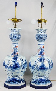 16 - PR 18th C DELFT LARGE GARLIC MOUTH VASES Pair of 18th century Delft blue and white pottery vases of Garlic-Mouth form with cobalt accents. Each depicts a hunting scene with figures, dogs and birds along with Chinese inspired decoration. Each vase has been mounted as a lamp and measures 36 1/2" overall height. Each pottery vase measures 24" height excluding base and hardware.