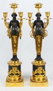 18 - PR FRENCH EMPIRE BRONZE & ORMOLU CANDELABRA Pair of French Empire bronze and ormolu figural 3-light candelabra. Each measures 21 3/4" height.