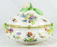 24 - HEREND QUEEN VICTORIA PORCELAIN LARGE TUREEN Herend porcelain large handled soup tureen in the Queen Victoria (Green Border) pattern. Cauliflower handle to lid. Antique mark to underside. Measures 14" length x 9 1/2" width.