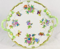 25 - HEREND QUEEN VICTORIA PORCELAIN SERVING PLATTER Herend porcelain round serving platter with handles in the Queen Victoria (Green Border) pattern. Marked to underside. Measures 14 1/2" length.