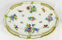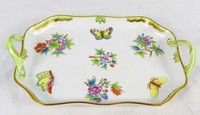 26 - HEREND QUEEN VICTORIA PORCELAIN HANDLED TRAY Herend porcelain handled tray in the Queen Victoria (Green Border) pattern. Marked to underside and measures 10 7/8" length.