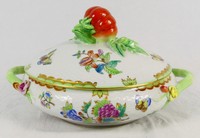 29 - HEREND QUEEN VICTORIA PORCELAIN TUREEN w TOMATO Herend porcelain covered and handled tureen with tomato handle in the Queen Victoria (Green Border) pattern. Holds antique mark to underside. Measures 11 3/8" length.
