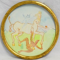 2 - LUIGI ONTANI 'NESSO SESSO' WATERCOLOR ON PAPER Luigi Ontani (Italian, b. 1943) watercolor on paper depicting an erotic scene with centaur, nude woman and cherub. Signed to verso and titled 'Nesso Sesso' or 'Sex Connection'. Measures 11 3/8" diameter + 5/8" frame.