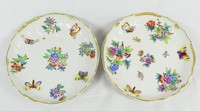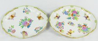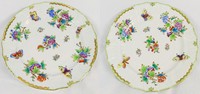 30 - 2pc HEREND QUEEN VICTORIA ROUND SERVING DISHES Two Herend porcelain round serving platters in the Queen Victoria (Green Border) pattern. Each holds antique mark to underside. Measuring 11 3/4" and 12 1/4" diameter.