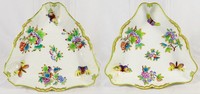 31 - 2pc HEREND QUEEN VICTORIA PORCELAIN TRIANGLE BOWLS Two Herend porcelain triangular vegetable bowls in the Queen Victoria (Green Border) pattern. Marked to underside and measures 10" width.