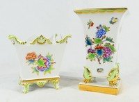 34 - 2pc HEREND QUEEN VICTORIA PORCELAIN SQUARE VASES Two Herend porcelain vases in the Queen Victoria (Green Border) pattern. Each marked to underside. Measuring 6 3/4" and 4 5/8" height.