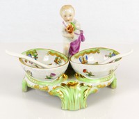 36 - HEREND QUEEN VICTORIA PORCELAIN DOUBLE SALT Herend porcelain double salt with putti in the Queen Victoria (Green Border) pattern. Includes two unmarked porcelain spoons. Holds antique mark to underside of salt cellar. Measures 5 1/4" length x 4 1/2" height.