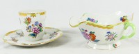 38 - 2pc HEREND QUEEN VICTORIA GRAVY & EGG CUP Two pieces of Herend porcelain in the Queen Victoria (Green Border) pattern. Includes a handled gravy-9" and cup with attached saucer-6". Each holds antique mark to underside.
