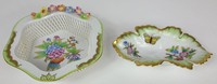 39 - 2pc HEREND QUEEN VICTORIA PORCELAIN BOWLS Two pieces of Herend porcelain in the Queen Victoria (Green Border) pattern. Includes basket weave bowl-5 3/4" and leaf dish-5 7/8". Each marked to underside.