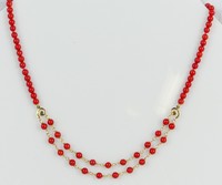 41 - 14kt YELLOW GOLD & RED CORAL BEADED NECKLACE 14kt yellow gold and red coral beaded necklace with partial double strand. Hallmarked and marked 14K near clasp. Beads measures approx 4.5mm diameter. Measures 16 1/2" length. Total weight 11.7g.
