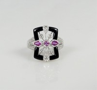 42 - 14kt WHITE GOLD DIAMOND ONYX & AMETHYST RING 14kt white gold ring with diamonds, onyx and amethys. Marked 14K, 585. Ring size 8. Total weight 5.9g.
