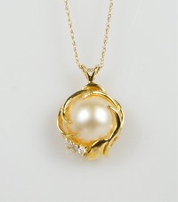43 - 14kt YELLOW GOLD DIAMOND & PEARL PENDANT w CHAIN 14kt yellow gold pendant with captive pearl and diamond accents. Pendant measures 14mm width x 21mm length with bail. 14k yellow gold chain necklace measures 18" length. Marked 14K. Total weight 3.1g.