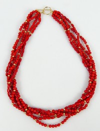 44 - 14kt YELLOW GOLD & RED CORAL 5-STRAND NECKLACE 14kt yellow gold and red coral 5-strand necklace. Marked 14K. Measures 17 1/2" length. Total weight 42.5g.