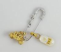45 - 3pc 14kt WHITE GOLD SAFETY PIN w 14kt YG CHARMS 14kt white gold safety pin with diamond accents. Marked 14K and measures 1 5/8". 14kt yellow gold carriage charm. Marked 14K DZ and measures 18mm. Opal slipper marked 750 with lozenge hallmark, measures 1 1/8" including bail. Total weight 6.6g.