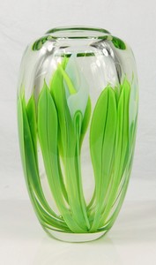 6 - ORIENT & FLUME ART GLASS LILIES VASE Scott Beyers for Orient & Flume studio art glass vase with calla lilies motif. Signed to underside. Measures 10" height.
