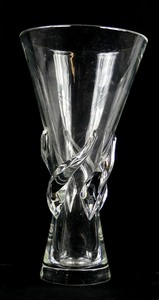 9 - STEUBEN GLASS VASE w APPLIED LEAF-FORMS Steuben glass vase with applies spiraling leaf-forms. Signed to underside. Measures 11 5/8" height.