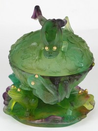 12 - DAUM FROGS ON LILY PAD PATE-DE-VERRE CRYSTAL BOWL Daum France Pate de Verre covered crystal bowl decorated with six frogs with gold eyes. Bowl having lily pad motif throughout with frog-form handle to lid. Signed to side of base and holds original label to underside. Measures 8 1/2" height x 7 1/2" width.