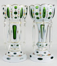14 - PR BOHEMIAN WHITE TO EMERALD GLASS LUSTERS Pair of Bohemian white cut to emerald glass mantle lusters with hanging prisms. Each with floral and gilt accents measuring 12 3/4" height.