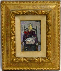 19 - WALTER SPITZER 'GRANDMOTHER w CAT' OIL ON CANVAS Walter Spitzer (Polish, 1927-2021) oil painting on canvas depicting a seated grandmother holding a cat. Signed upper right. Measures 5 1/2" x 3 5/8" + 3 1/2" frame.