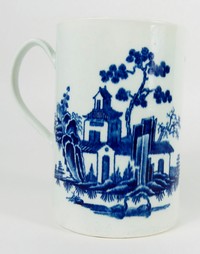 26 - WALL WORCESTER BLUE & WHITE PORCELAIN MUG Dr. Wall Worcester blue and white porcelain mug. Decorated with house, bamboo, flowers and fence. Holds crescent mark to underside. Measures 6" height x 5 1/2" length.