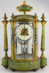 2 - TIFFANY & CO MARTI CHAMPLEVE & ONYX MANTLE CLOCK 19th century French Tiffany & Company / Samuel Marti bronze and green onyx mantle clock. Hand painted porcelain and filigree dial. Case having enameled champleve decoration throughout. Marked Tiffany & Co to dial. Mechanism marked Marti et Cie, Medaille D'argent, 1889. Includes key and pendulum. Measures 17" height x 11 1/2" width.