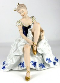 32 - WALLENDORF SEATED BALLERINA PORCELAIN FIGURINE Wallendorf porcelain figure of a Ballerina with gold slippers. Model 1318/2. Marked to underside. Measures 10" height and width.