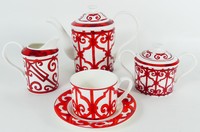 33 - HERMES 'BALCON DU GUADALQUIVIR' PORCELAIN TEA SET Hermes fifteen piece porcelain tea set in the 'Balcon du Guadalquivir' pattern. Includes 6 teacups-4 5/8", 6 saucers-6 1/8", covered sugar-6 3/4", creamer-5" and teapot-9 1/4". Each marked to underside.