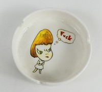 39 - YOSHITOMO NARA 'FUCK' GLAZED PORCELAIN ASHTRAY Yoshitomo Nara (Japanese/American, b. 1959) glazed porcelain ashtray depicting a girl with crossed arms. Captioned "Fuck". Measures 4" diameter.