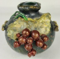 42 - AMPHORA TURN TEPLITZ IRIDESCENT POTTERY VASE Amphora Edda Austrian iridescent pottery vase of bulbous form having twin handles and applied grape and leaf decoration. Holds crown, marked Amphora, Austria and numbered 3286 (?) to underside. Measures 4" height and 4" width.