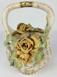 43 - AMPHORA TURN TEPLITZ HANDLED POTTERY BASKET Amphora Turn Teplitz Austrian handled pottery basket decorated with flowers, leaves and vines. Holds crown, marked Amphora, Austria and numbered to underside. Measures 7 1/2" height x 6 1/2" width.