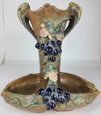 47 - AMPHORA TURN TEPLITZ POTTERY CENTERPIECE VASE Amphora Turn Teplitz Austrian pottery centerpiece vase with grape and vine decoration. Appears to be marked Amphora and numbered 3586 38 to underside. Measures 11 1/2" height x 11 1/2" width.