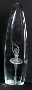 49 - SWEDISH ART GLASS SCULPTURE w ETCHED BALLERINA Strombergshyttan Swedish art glass sculpture with etched ballerina. Signed, numbered and dedicated to underside. Measures 14 1/4" height.