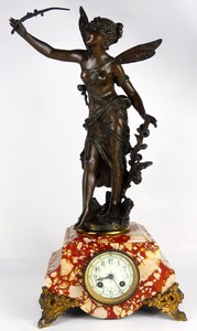 4 - LOUIS MOREAU 'FEE AUX ROSES' BRONZE & MARBLE CLOCK 19th century French marble clock with hand painted dial and bronze mounts, flanked by a Louis Moreau bronze sculpture depicting a winged nymph with flowers. Bronze signed L. Moreau and holds plaque. Includes two keys and pendulum. Also includes certification from Enrique Del Val, Madrid, 1978. Clock measures 21 1/2" height x 10" x 6".