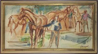 5 - FAY MOORE 'HORSES' OIL PAINTING ON CANVAS Fay Mowery Moore (American, 20th C) oil painting on canvas depicting horses' Titled 'Yearlings on Display'. Signed lower right. Holds remnant of originla label to verso. Measures 30 1/2" x 15 1/2" + 2" frame.