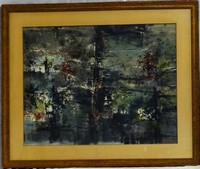 6 - VINCENT HARTGEN LANDSCAPE WATERCOLOR ON PAPER Vincent Andrew Hartgen (American, 1914-2003) watercolor on paper depicting an abstract landscape. Signed lower right. Measures 27 1/2" x 21 1/2" + 4" mat & frame.