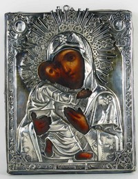9 - ANTIQUE RUSSIAN 84 SILVER ICON 'MOTHER & CHILD' 19th Century Russian icon depicting Madonna and Child. Marked to lower edge of silver mount 84, dated 186? and holds additional hallmarks. Measures 9" x 7".