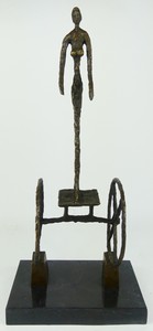 10 - ALBERTO GIACOMETTI 'THE CHARIOT' BRONZE SCULPTURE Bronze sculpture depicting a figure standing above two wheels after Alberto Giacometti (Swiss, 1901-1966). Signed beside figure's right foot. Measures 17 1/4" height + 1 1/4" marble base.