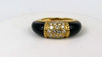 11 - VAN CLEEF & ARPELS ONYX & DIAMOND PHILIPPINE RING Van Cleef and Arpels 18kt yellow gold and diamond ring with carved onyx shoulders. Signed VCA, marked 18K and numbered. Ring size 5.