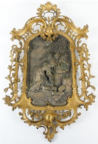 18 - 2pc WHITE METAL RELIEF PLAQUES w FRAME Two French metal relief plaques and one ornate gilt metal frame. One plaques depicts lovers at the well. Second plaque depicts a couple standing on stairs above a village. Frame can accommodate either plaque. Plaques measures 14 1/4" x 8 1/2". Frame measures 24" x 14 1/2".