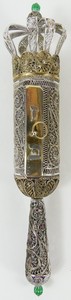 1 - JUDAICA SILVER FILIGREE GEM-SET MEGILLAH CASE Judaica parcel gilt silver filigree Book of Esther Megillah scroll case with small diamonds, rubies and sapphires. Measures 8 1/4" length.