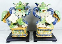 21 - PR CHINESE SANCAI GLAZED FOO LIONS Pair of Chinese Sancai glaze porcelain foo dogs. Each measures 13" width x 16" height + 2" wooden base.